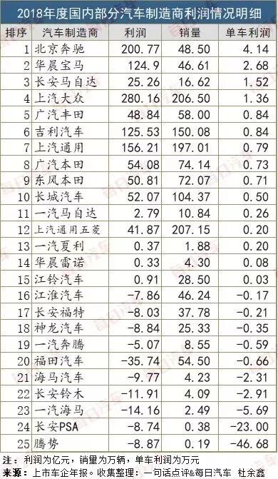 有媒体通过上市车企公布的2018年财报统计了部分汽车制造商的利润情况,究竟谁在国内卖车最赚钱?从统计情况来看,北京奔驰拔得头筹,2018年实现净利润200亿元,全年销量达到48.5万辆,单车利润达到4.14万元。