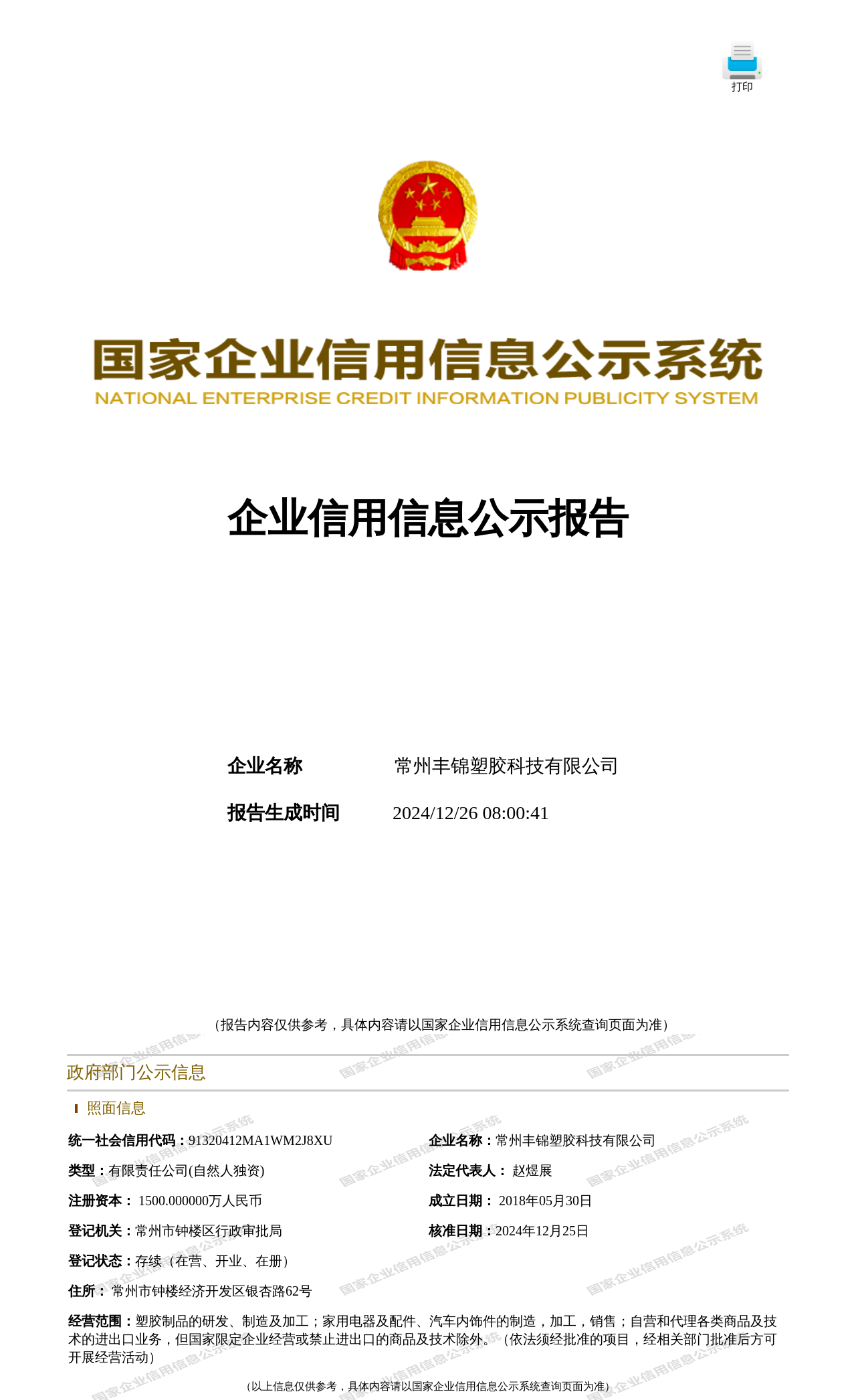 | 统一社会信用代码 | 91320412MA1WM2J8XU | 成立时间 | 2018-05-30 |