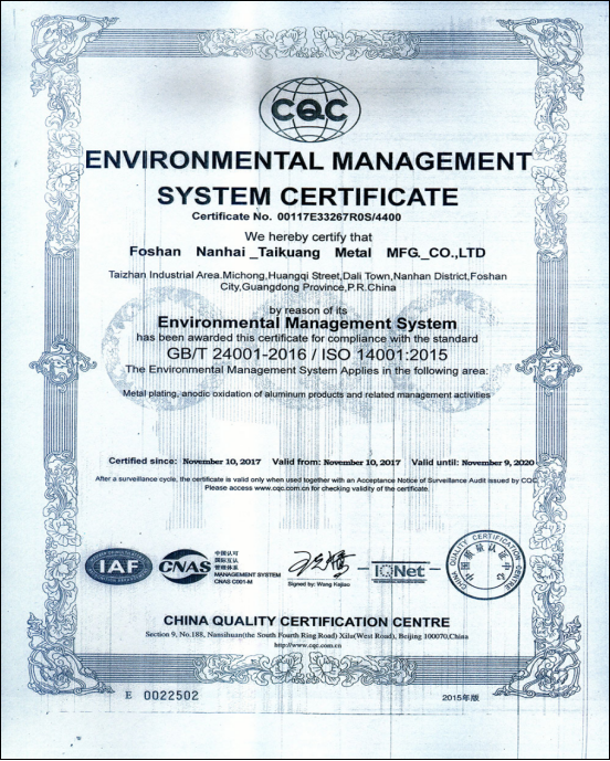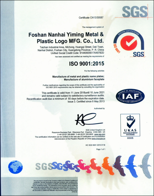 佛山市南海一铭金属塑料标牌有限公司于1993年8月投资建厂,厂区位于广东省佛山市南海区黄岐泌冲台展工业园区。公司地处珠三角。业生产各种金属、塑料标牌以及汽配件。有裁剪拉纹、CD圆花纹、高精密平版印刷、精密冲压、数控机加工、喷砂、氧化、镭射、注塑等多种工艺加工。公司厂房面积6000多平方米,拥有世界先进的机器设备,员工近1200人。并于1997年通过iso9001质量认证,2005年通过了ISO14001环保体系认证,2007年通过 IATF16949汽车行业质量体系。