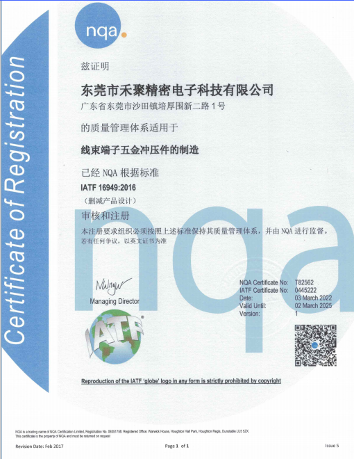 东莞市禾聚精密电子科技有限公司成立于2008年1月,坐落于广东省东莞市沙田镇稔洲村。本公司是一家致力于全球服务的电子冲压件方案提供及加工生产的一体化厂家。其产品广泛应用于微型马达,声学部件,连接器,传感器,继电器,电子线束,新能源电池,及电子元器件等电子部品。为新能源汽车,医疗电子,航空,智能家居,芯片封测,IC封装,汽车电子,消费电子及5G基站等行业提供了诸多定制化的精密五金零部件。2016年进入新能源动力电池部品领域,开始研发并生产新能源动力电池防爆片、密封铝钉、动力电池盖板等电池部品结构件。2021年开始汽车低压信号标准端子的国产化替代,主要应用新能源汽车智能座舱信号连接,0.64,0.5等已批量量产。
